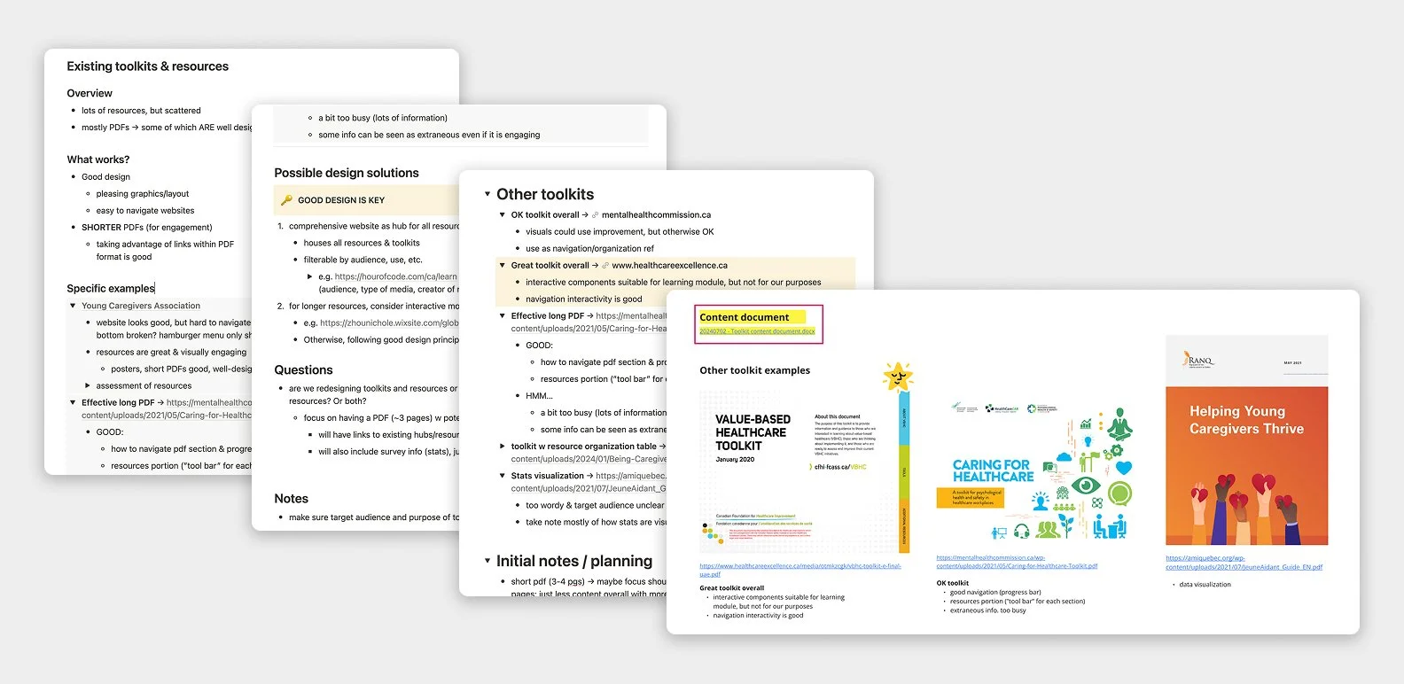 Soon after joining the project, I was tasked with identifying the best knowledge translation format for the RISE-UP project's research findings and co-design outputs. Considering feasibility and accessibility, I proposed formats such as websites and toolkits. Ultimately, a PDF toolkit was selected due to constraints with reaching the target audience—healthcare providers. I then conducted a media audit of existing PDF toolkits to inform the development of our own toolkit.