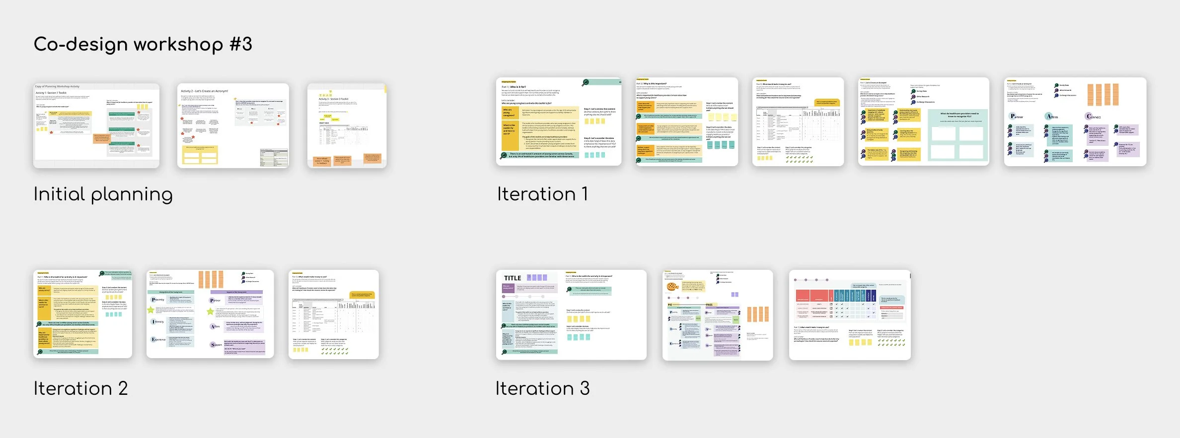 The co-design workshops were conducted online using Microsoft Teams and the collaborative whiteboard platform Miro. They were structured to engage participants in activities and encourage meaningful discussion. I helped design activities and facilitated a session during the third co-design workshop.