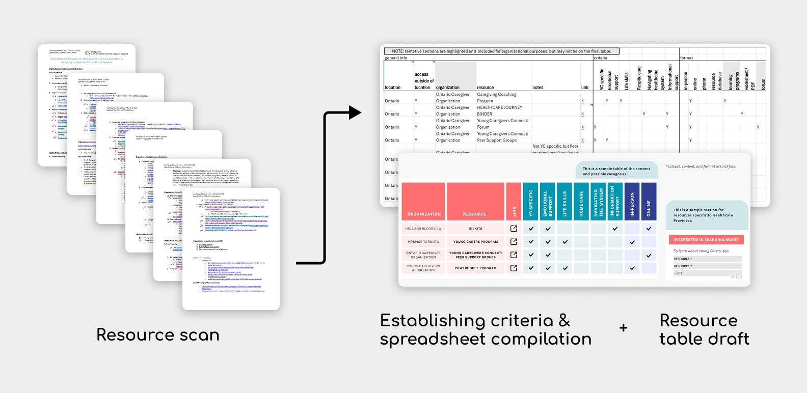The co-design sessions highlighted a need to share existing resources for young carers in the final knowledge translation product. I continued a Canada-wide resource scan started by the research co-investigator, Isabelle. I developed criteria to organize the resources and compiled them into a spreadsheet, which was later adapted into the toolkit’s resource table to help users easily find what they need.